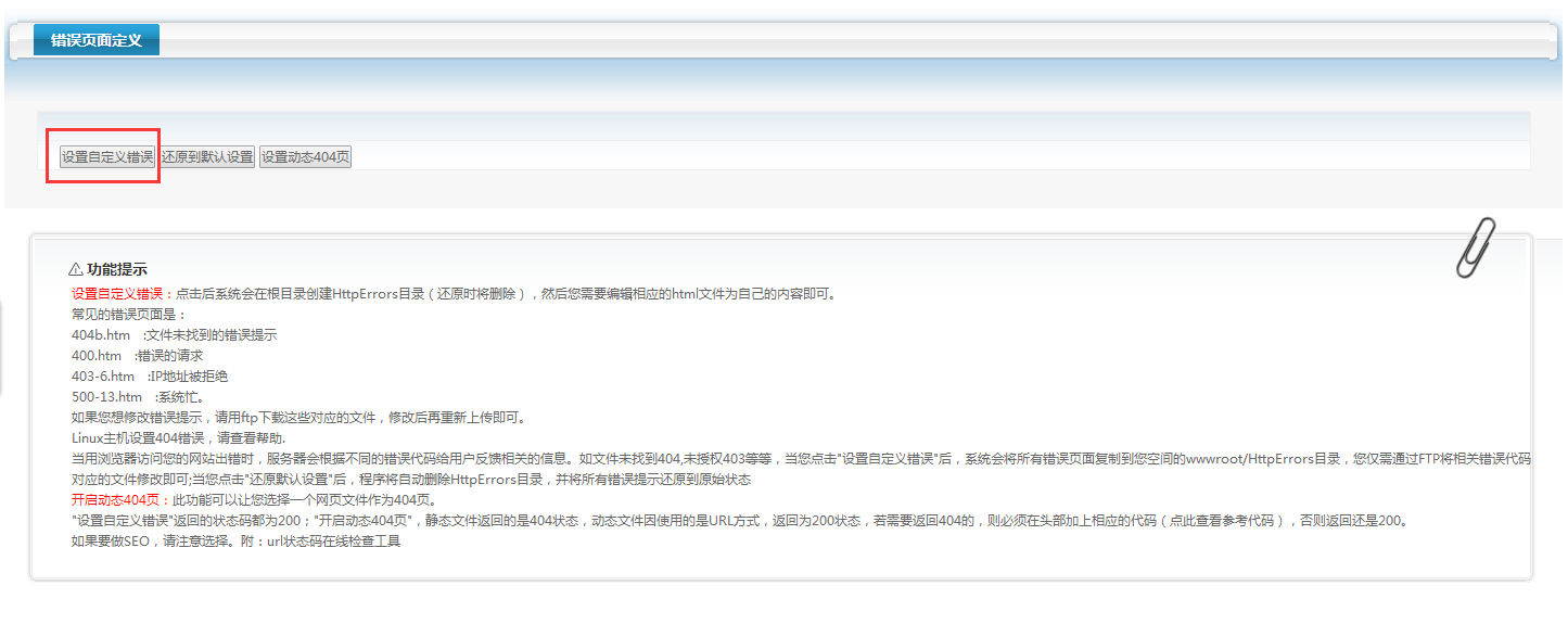 步骤一:打开你的主机控制面板,找到错误页面定义,设置自定义错误,点击之后会提示生成一个文件夹HttpErrors。